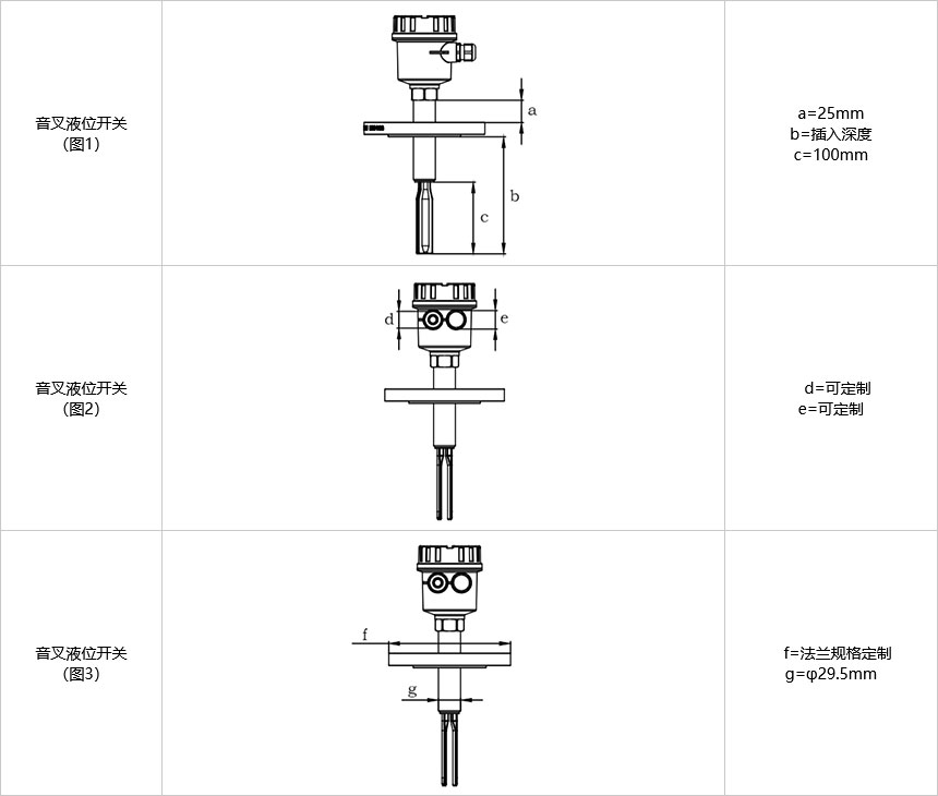 安裝要求:可利用罐體已有安裝孔,根據現場需要選擇安裝位置,一般選擇叉端向下垂直安裝、水平安裝或叉端向下傾斜安裝。如果介質較為粘稠應選擇垂直安裝。