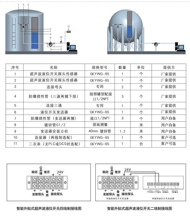 GKYWG-65外貼式超聲波液位開關(以下簡稱液位開關)是我公司研發生產的一種新型非接觸式液位檢測報警儀表。液位開關通過探頭傳感器產生的高頻超聲波脈沖可穿過容器壁,這個脈沖會在容器壁和液體中傳播,還會被反射回來。通過超聲波反射特性的檢測和計算,就可以判斷出容器內監測點是否有液體。同時液位變送器通過繼電器信號從而實現對液位的監測和控制,可適用于制藥、石油、化工、電力、食品、物流運輸等行業的液位過程控制。